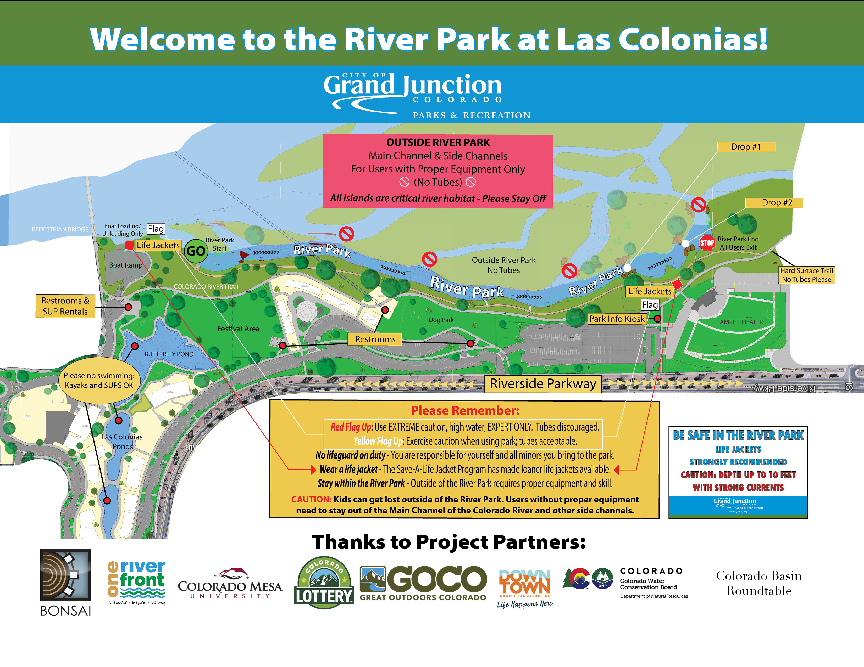Las Colonias Park is 130 acres and sits adjacent to downtown Grand Junction along the banks of the Colorado River. It has a diverse and rich history, as it is situated just upstream from the namesake of the community, the confluence of the Gunnison and Colorado Rivers, and has strong connections to the rest of the community, along with an existing and expanding Riverfront Trail system. Several new facility elements have been completed, including the River Park, restrooms, shelters, and concessions.