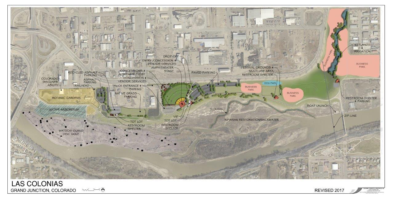 Las Colonias Park is 130 acres and sits adjacent to downtown Grand Junction along the banks of the Colorado River. It has a diverse and rich history, as it is situated just upstream from the namesake of the community, the confluence of the Gunnison and Colorado Rivers, and has strong connections to the rest of the community, along with an existing and expanding Riverfront Trail system. Several new facility elements have been completed, including the River Park, restrooms, shelters, and concessions.